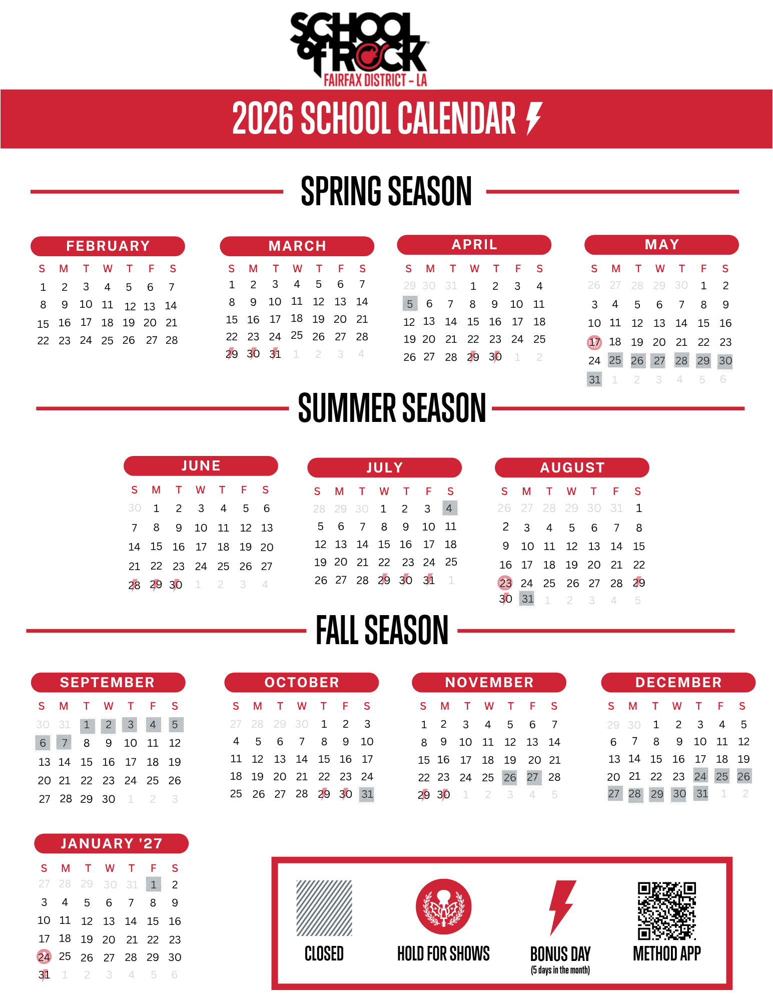 As part of our efforts to enhance communication, we have now published a full calendar for 2026! Here, you'll be able to see the dates for our Seasonal Showcases, Holiday/Prep Week Closures and more - it will be available on the Parent Portal all year long, but we advise printing and posting somewhere easy to find!